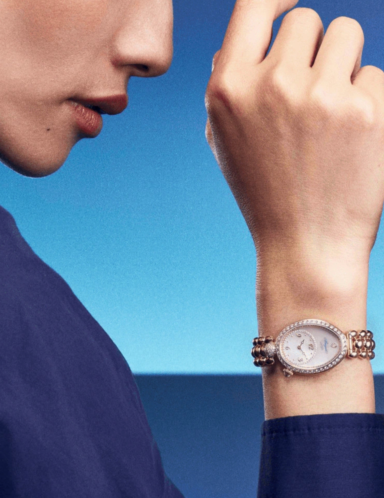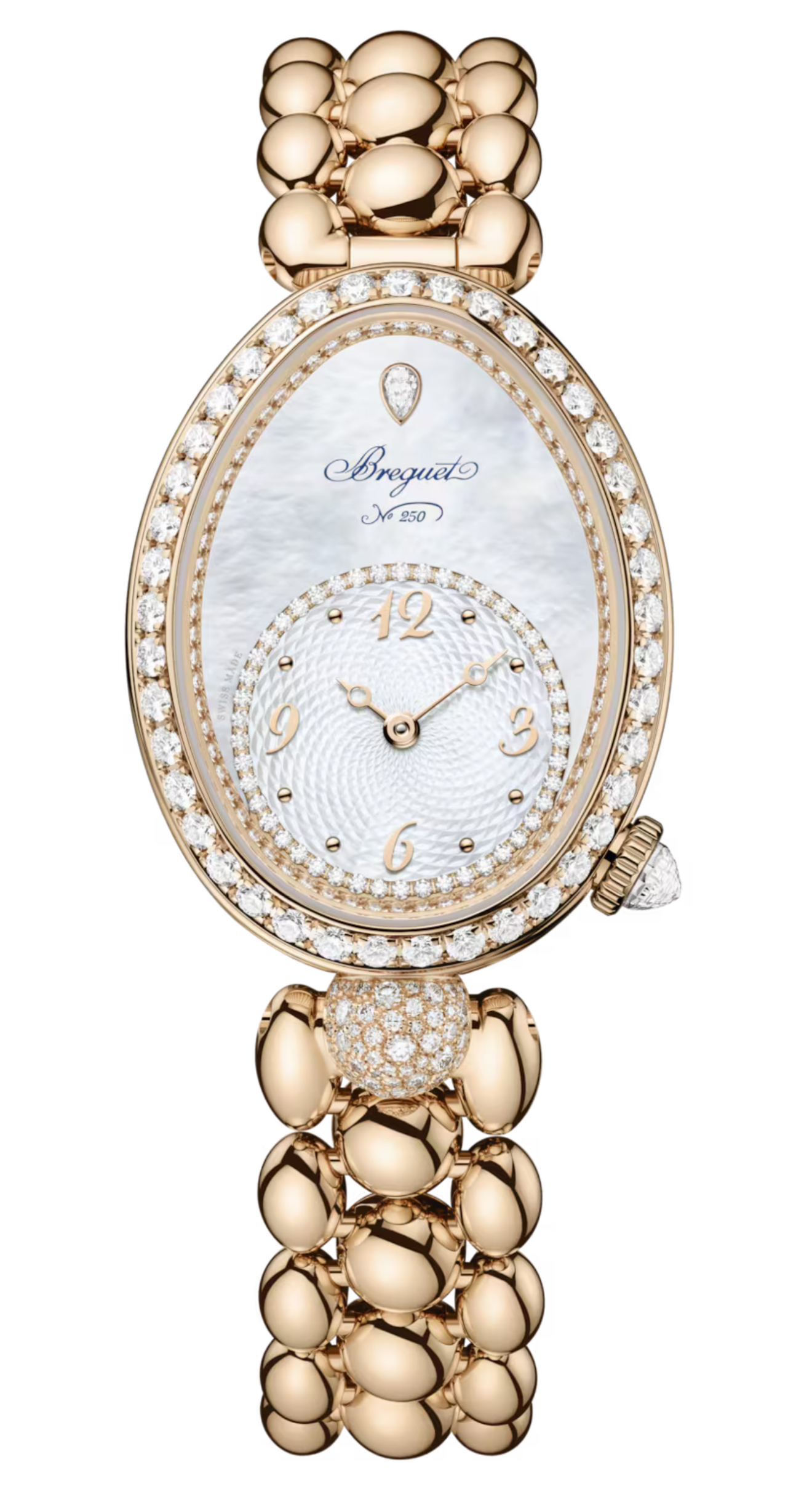 Однозначно, знаковая коллекция Reine de Naples от Breguet, получила новое обновления, осенью 2025 года, в миниатюрной модели 8925. Эти золотые часы 8925BH/5W J40 D0 имеют перламутровый циферблат, со смещенным маленьким циферблатом з гильошированным рисунком. Абсолютно новый золотой браслет с мягким звеньям из розового золота. Механизм з автоподзаводом.