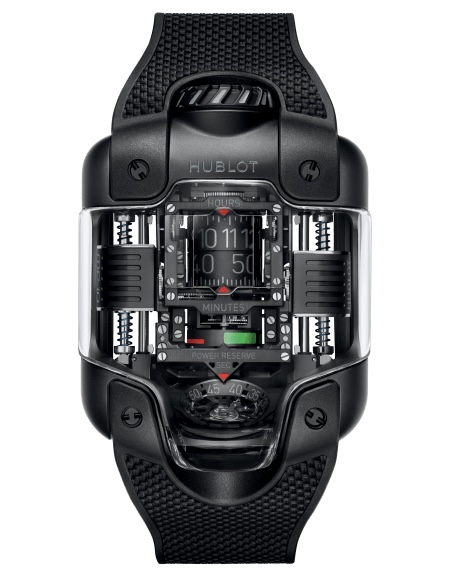 Как и многие часы Hublot, MP-10 не имеет циферблата. Однако, в отличие от большинства часов Hublot, у них нет стрелок. Вместо этого они оснащены четырьмя постоянно вращающимися цилиндрическими индикаторами, расположенными посередине уникального корпуса в форме подушки. В верхней трети циферблата расположены два диска, отображающие часы и минуты, которые оснащены невидимым увеличительным стеклом для лучшей читаемости и красными алюминиевыми стрелками для обозначения времени. Ниже расположен круглый индикатор запаса хода с прозрачными зелеными и красными зонами, показывающими оставшийся заряд.