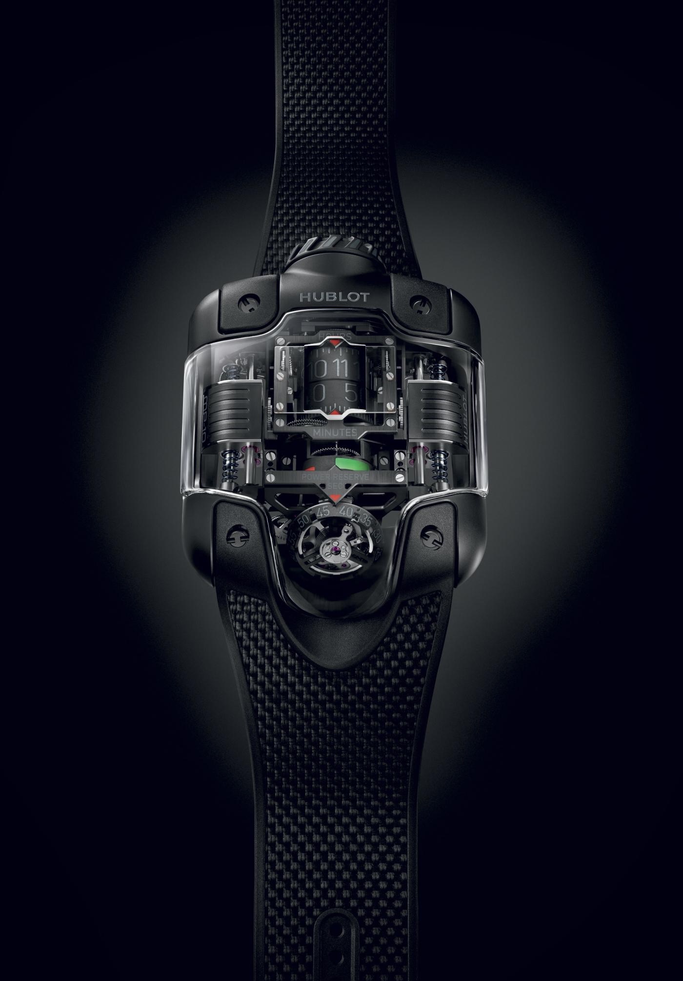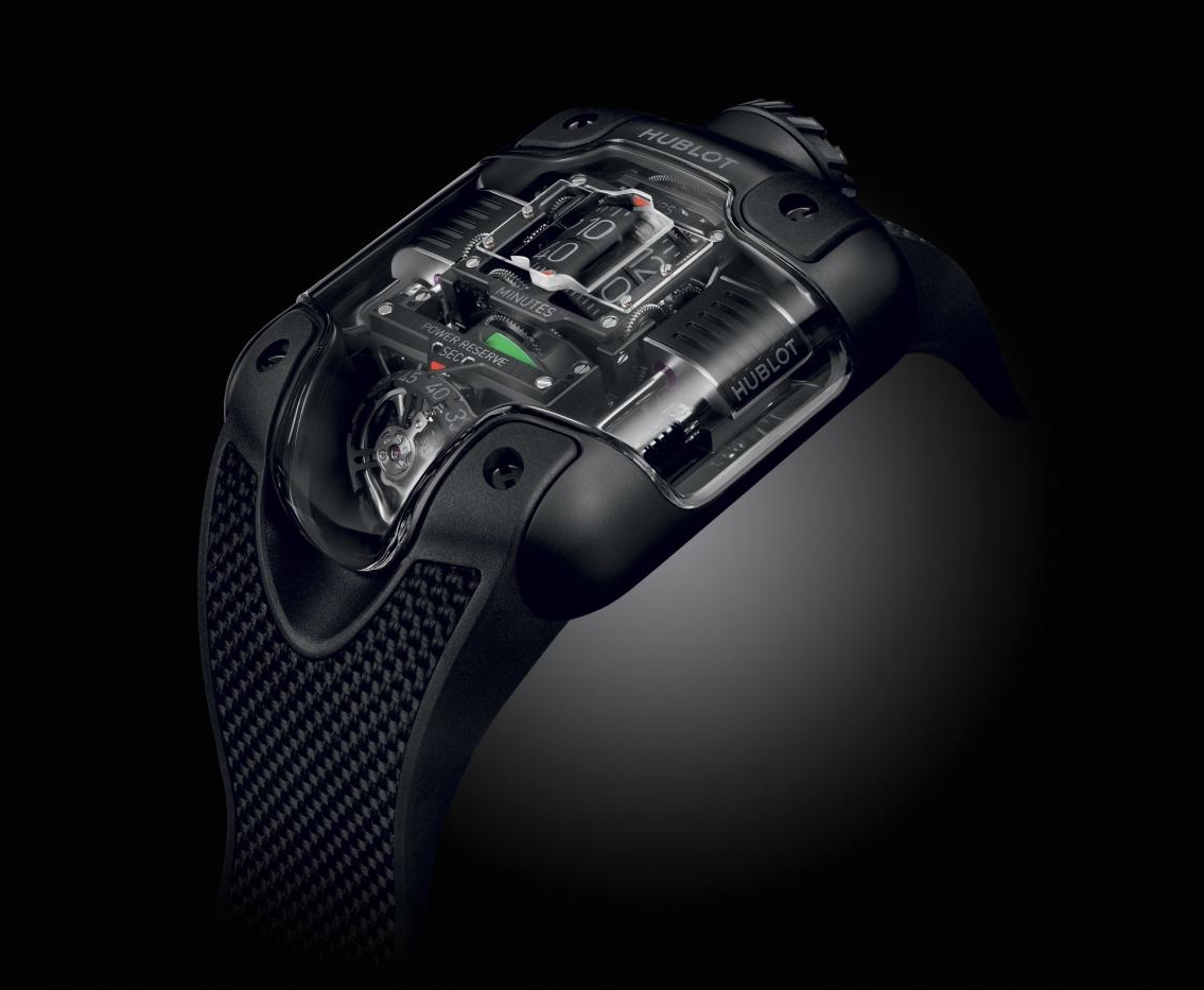 Наконец, в нижней трети циферблата расположен шестидесятисекундный турбийон, наклоненный под углом 35 градусов. Секунды отображаются непосредственно на каретке турбийона, что позволяет использовать его в качестве указателя малой секундной стрелки. Hublot объясняет, что вертикальная компоновка MP-10 интуитивно понятна и удобна для глаз: достаточно одного взгляда вниз, чтобы быстро определить время. Думаю, к этому нужно привыкнуть, и главная цель такого отображения времени — продемонстрировать мастерство часовщиков Hublot. Но я не жалуюсь: часы Hublot MP должны привлекать внимание, и MP-10 как раз к этому и относятся.