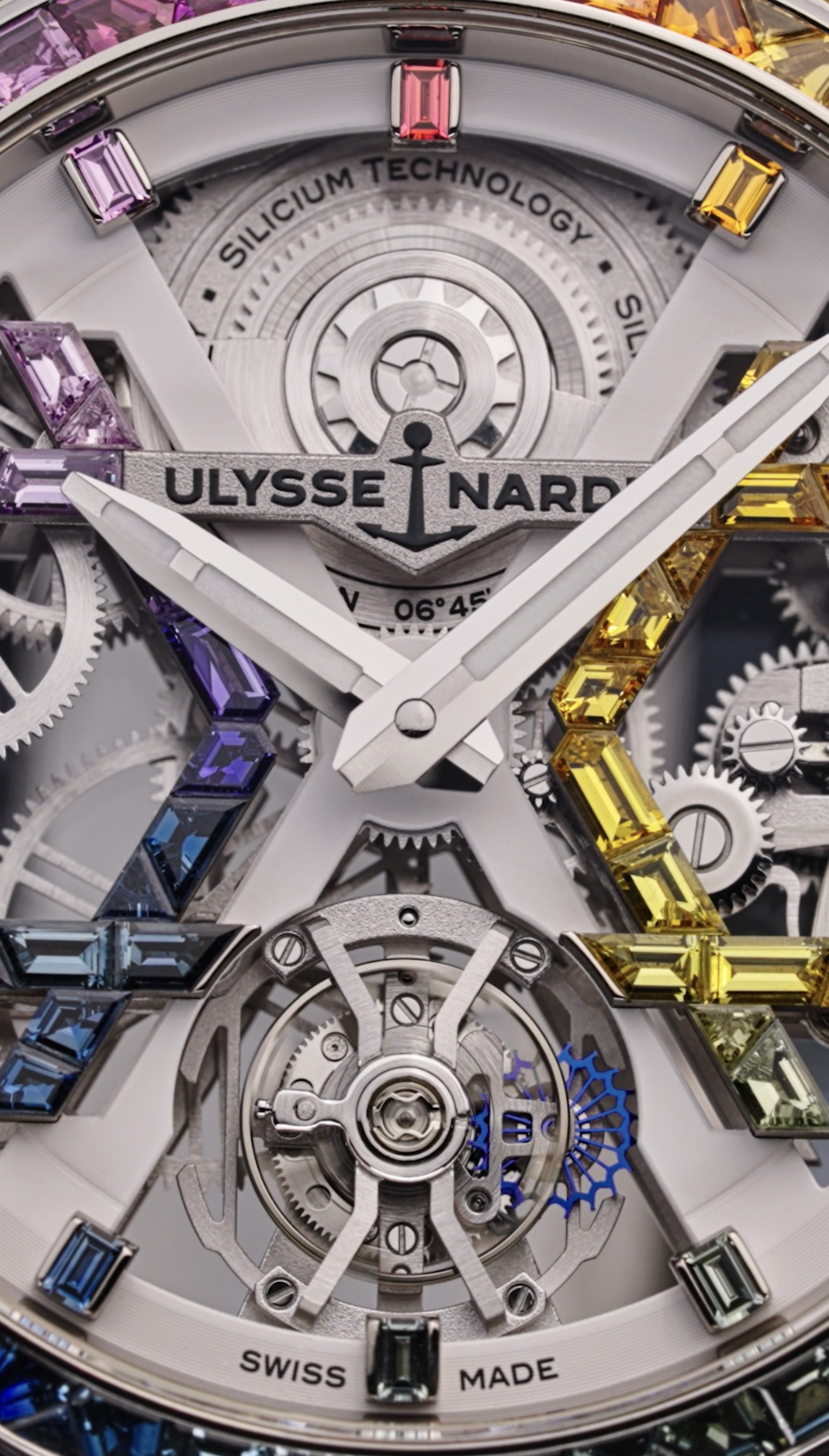 Новые часы Ulysse Nardin 2025 года Blast сверкают радугой сапфиров в невидимой оправе. Новые часы Blast Sparkling Rainbow – это лимитированная серия из восьми экземпляров, в которой бескомпромиссная форма Blast подчеркнута ослепительным набором цветных сапфиров, создающих одни из самых впечатляющих часов, когда-либо созданных мануфактурой Ulysse Nardin в Ле-Локле. Часы украшены 211 цветными сапфирами общим весом 13,33 карата, скрытыми в корпусе, безеле, заводной головке, циферблате и застежке. Вместе эти камни преображают Blast, представляя собой не только авангардный дизайн и техническое мастерство, но и шедевр высокого ювелирного искусства.