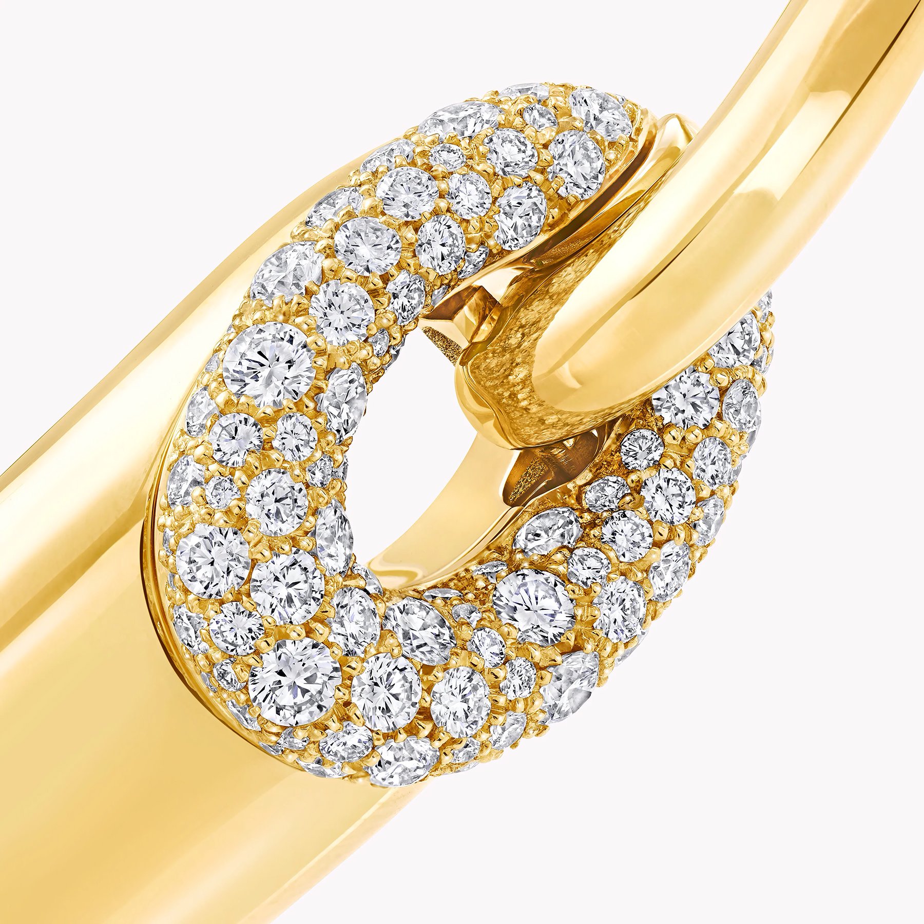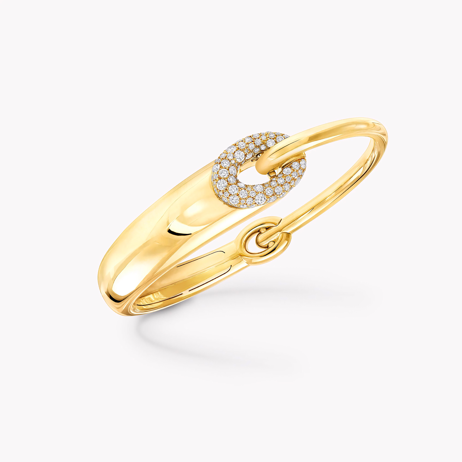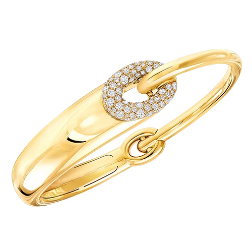 Смелый и утончённый браслет Be Together из жёлтого золота впечатляет гармонией формы и блеска. Его динамичная линия из отполированного металла мягко огибает запястье, завершаясь выразительным овальным звеном, полностью украшенным бриллиантами паве. Контраст между сияющей гладью золота и роскошным мерцанием камней создаёт эффект живого движения и безупречной элегантности.