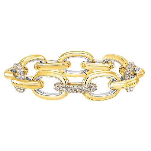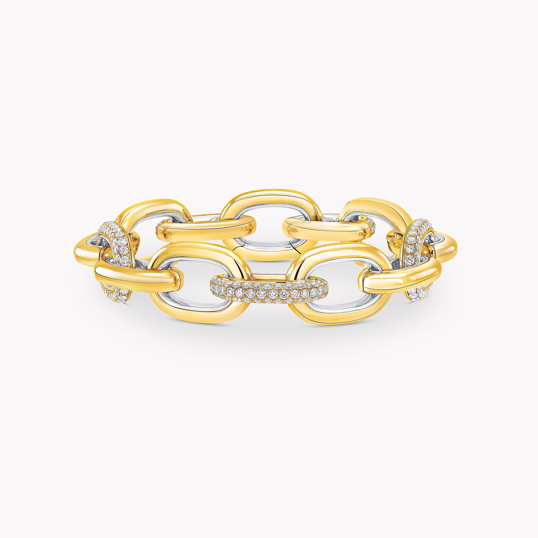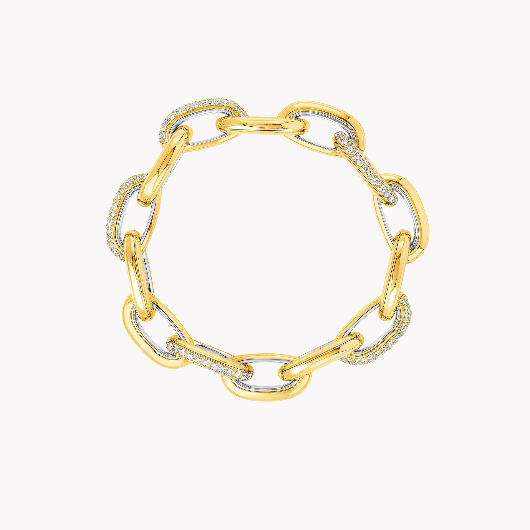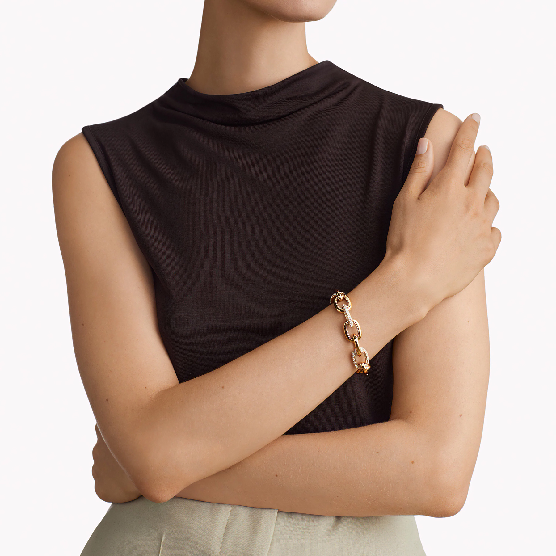 Изысканный браслет Be Together из жёлтого золота воплощает гармонию формы, света и блеска. Его дизайн основан на чередовании гладких овальных звеньев из полированного золота и утончённых петель, инкрустированных бриллиантами паве. Мягкое соединение этих элементов символизирует прочную, неразрывную связь — изящную метафору любви, единства и вечности.