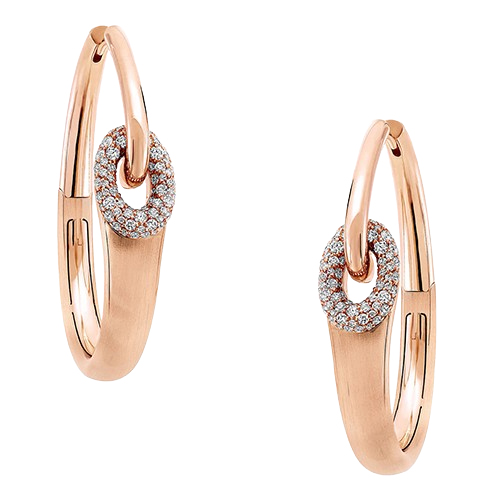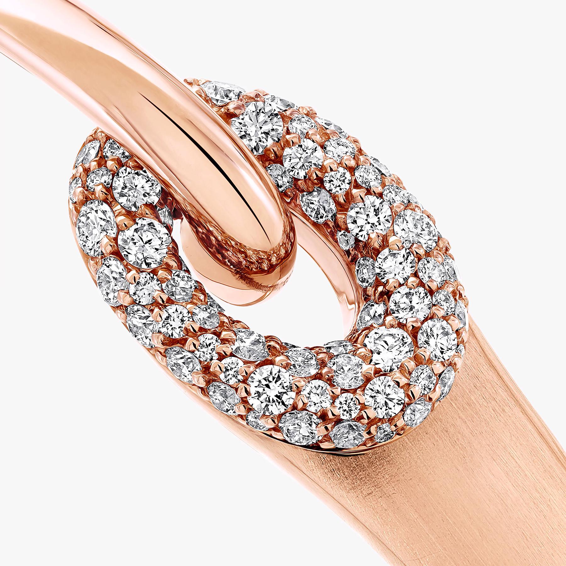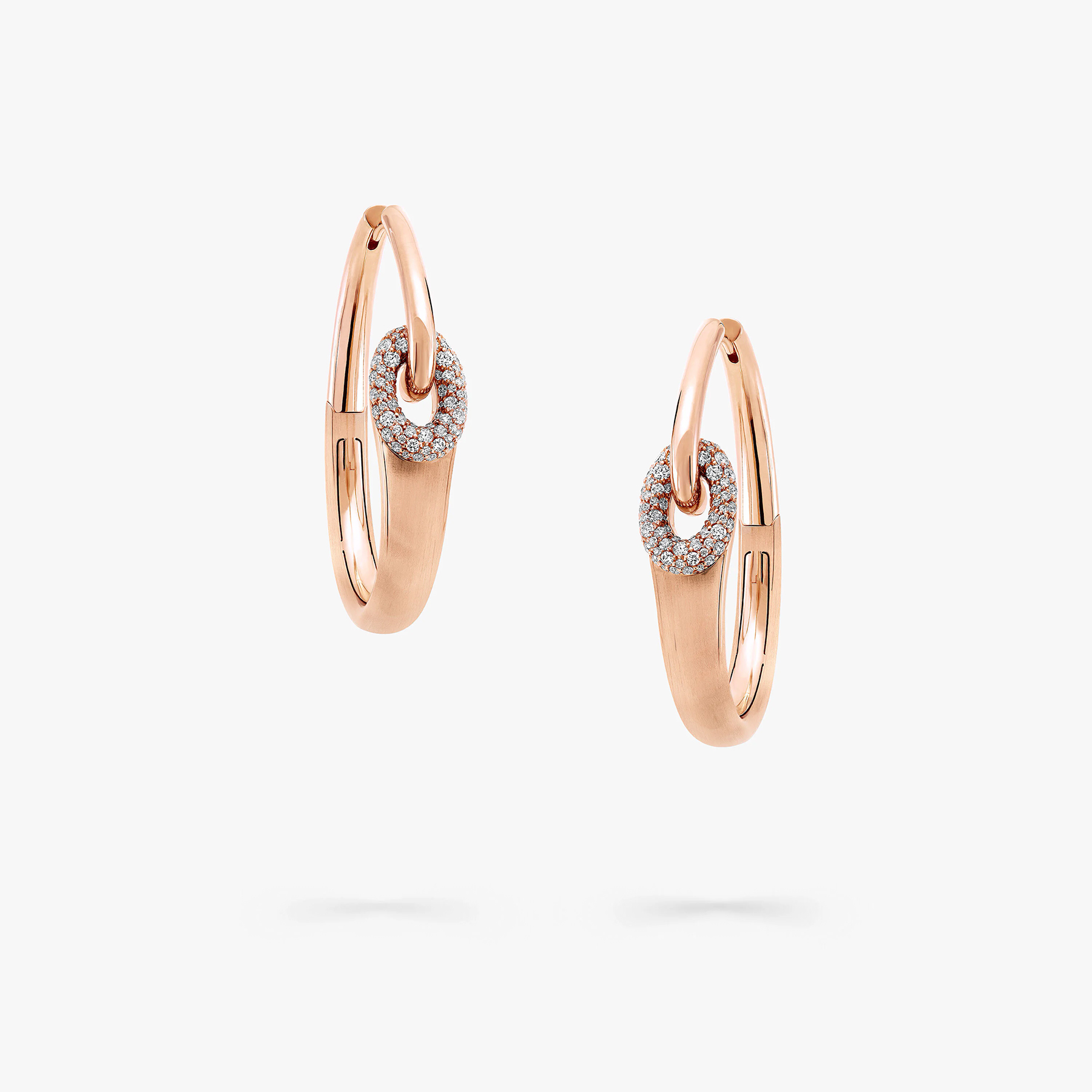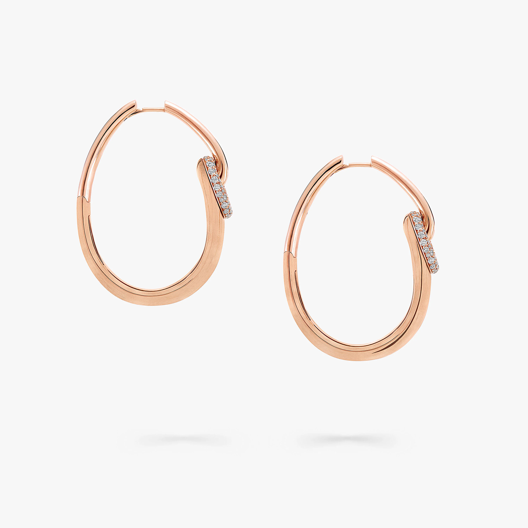 Современные серьги-кольца Be Together из розового золота впечатляют элегантностью и мягкой игрой света. Их изящный изгиб, выполненный из отполированного розового золота, постепенно переходит в бархатисто-матовую поверхность, создавая утончённый контраст фактур. Композицию завершает овальное звено, украшенное паве из сверкающих бриллиантов, придающее украшению яркое, но изысканное сияние.
