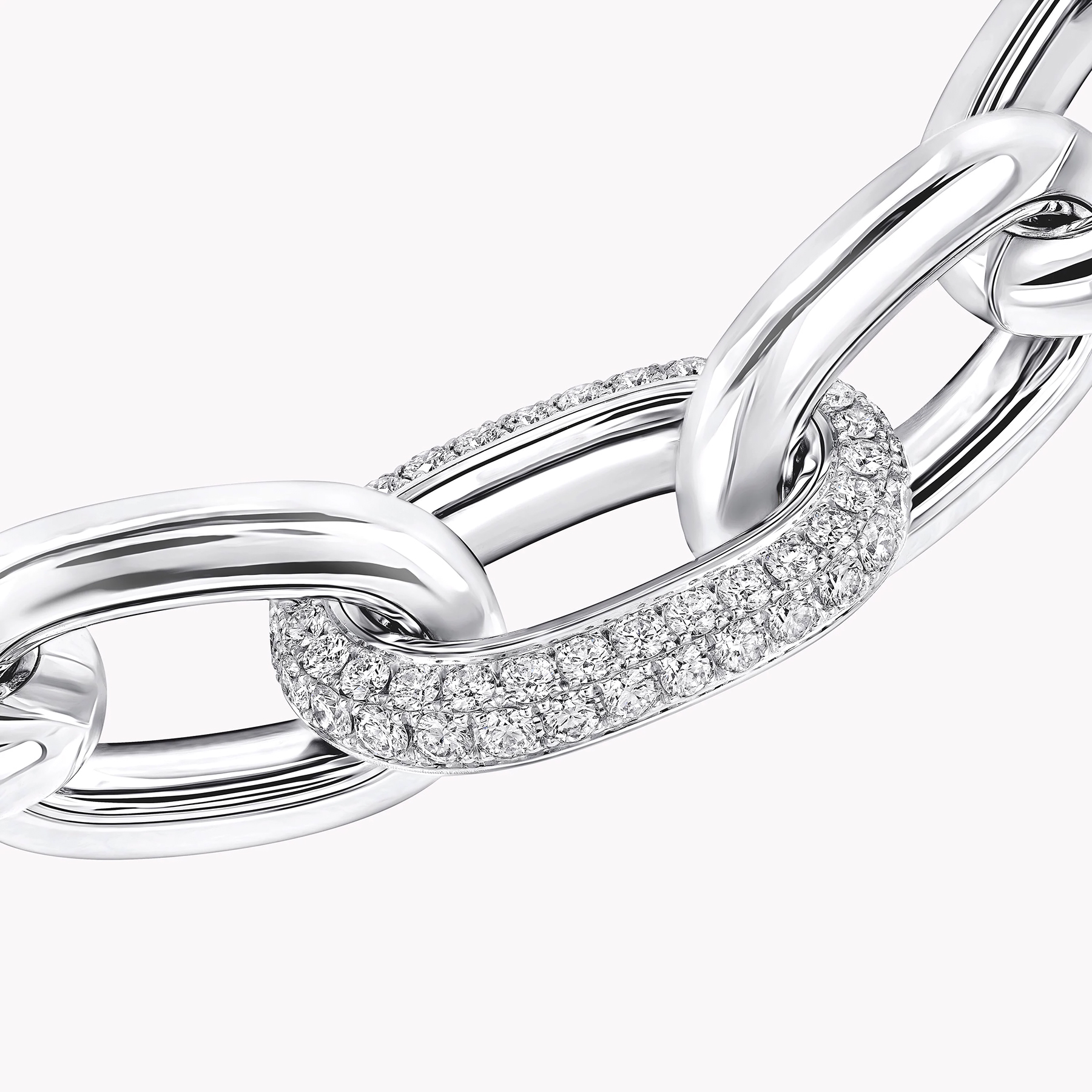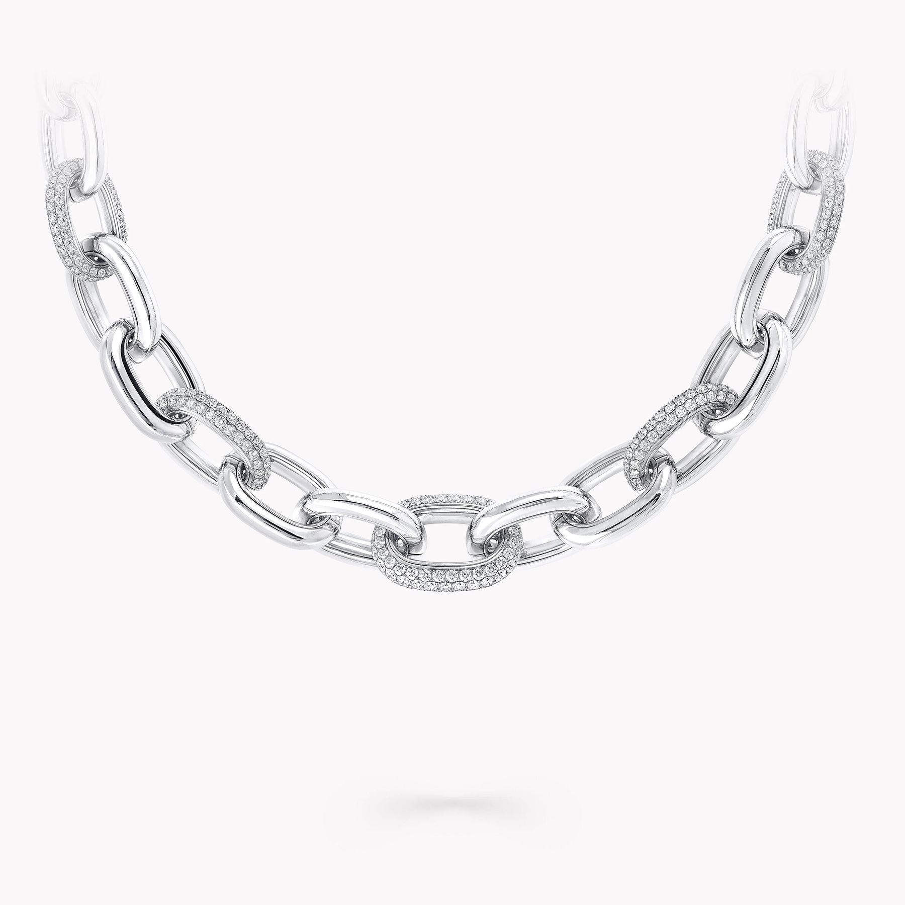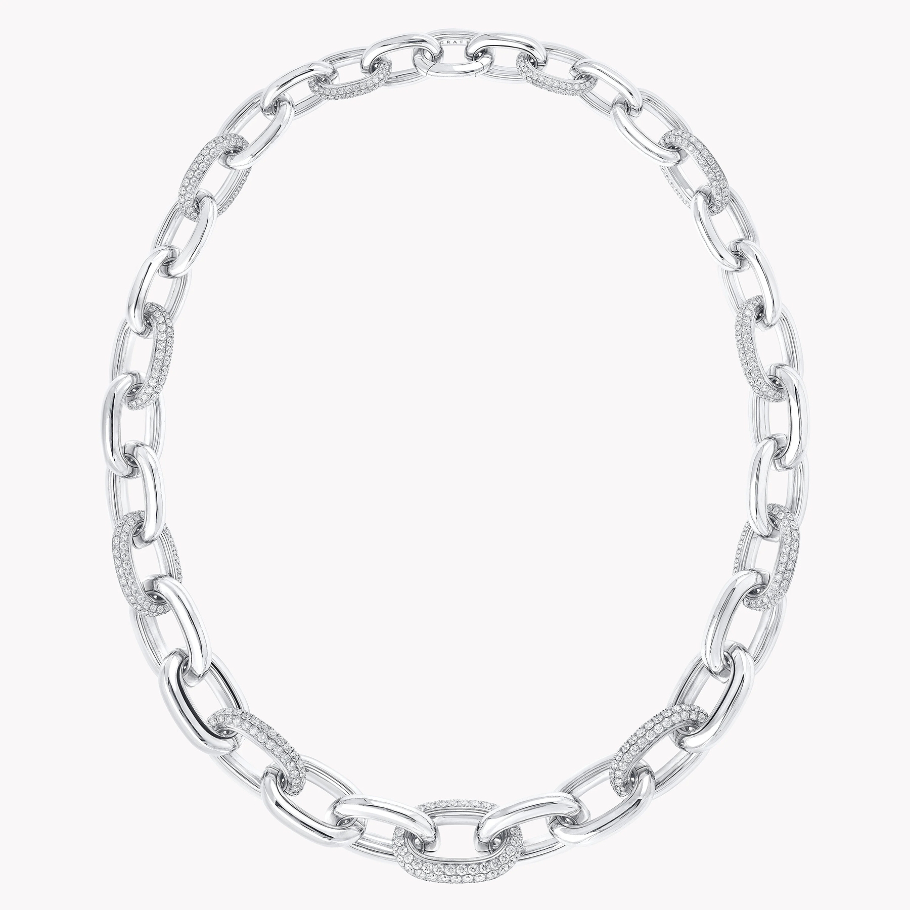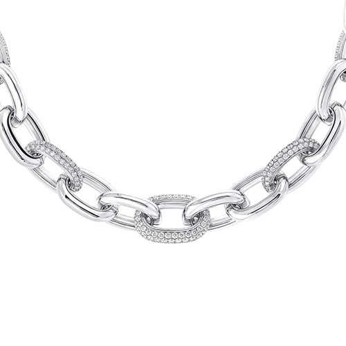 Яркое и смелое по дизайну, ожерелье Be Together из белого золота воплощает идею вечной связи и непрерывного единства. Его современный силуэт построен на чередовании гладких овальных звеньев из полированного белого золота и сияющих элементов, полностью усыпанных бриллиантами паве. Игра света на контрасте блестящего металла и мерцающих камней создаёт эффект бесконечного движения и безупречной гармонии.