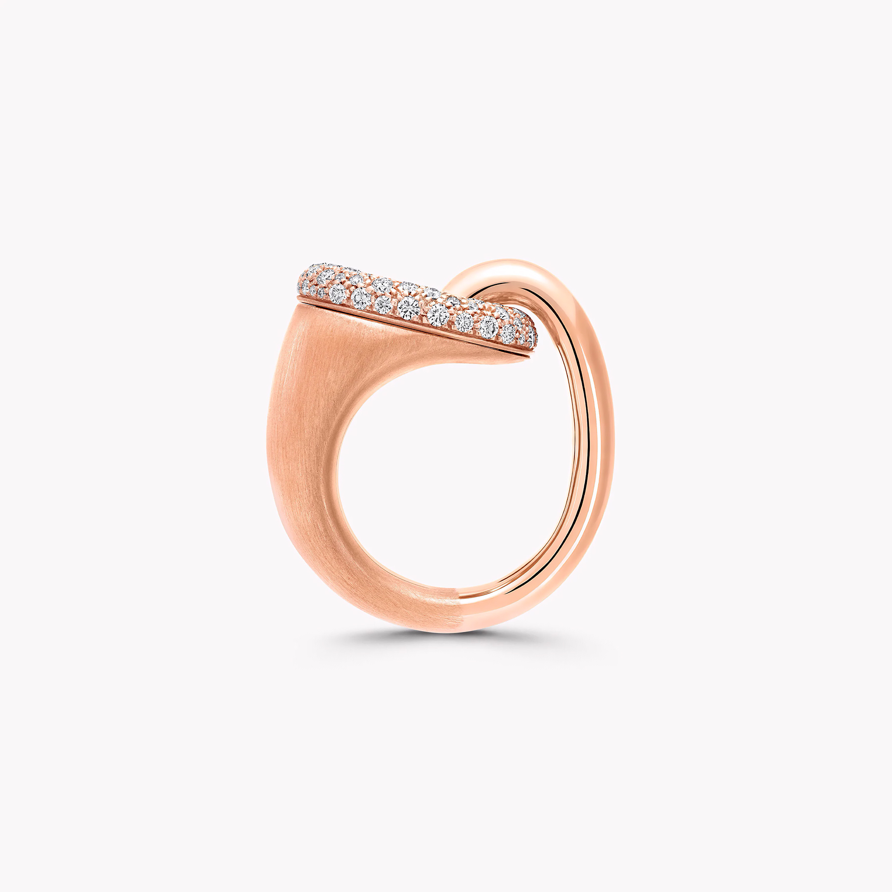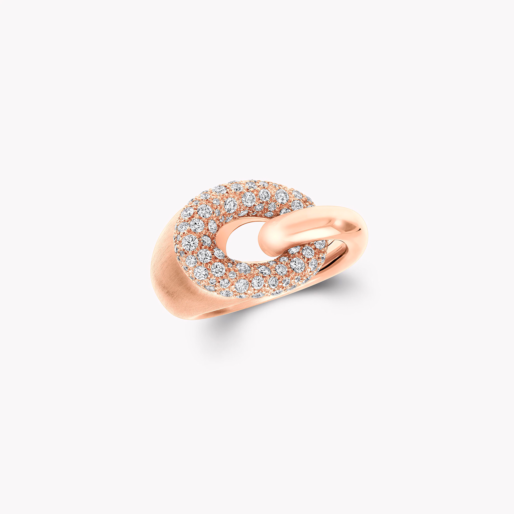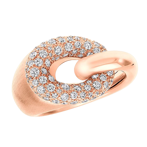 Эффектное кольцо Be Together из розового золота воплощает современную элегантность и мягкую чувственность. Его изящная линия, выполненная из полированного розового золота, плавно переходит в деликатную матовую поверхность, создавая изысканный контраст фактур. Кольцо соединено с овальным звеном, усыпанным бриллиантами паве огранки, которые добавляют композиции сияния и глубины.