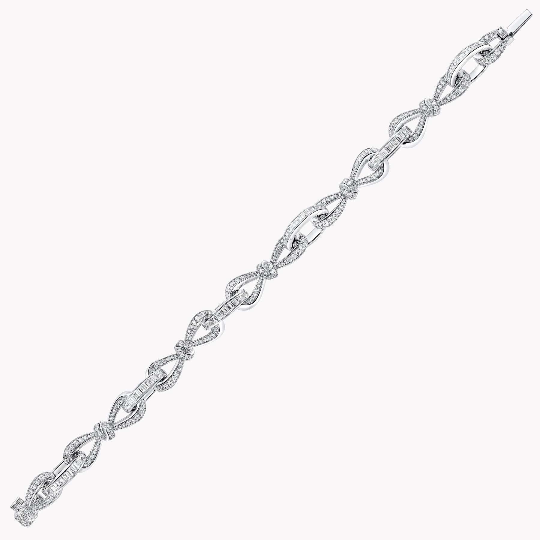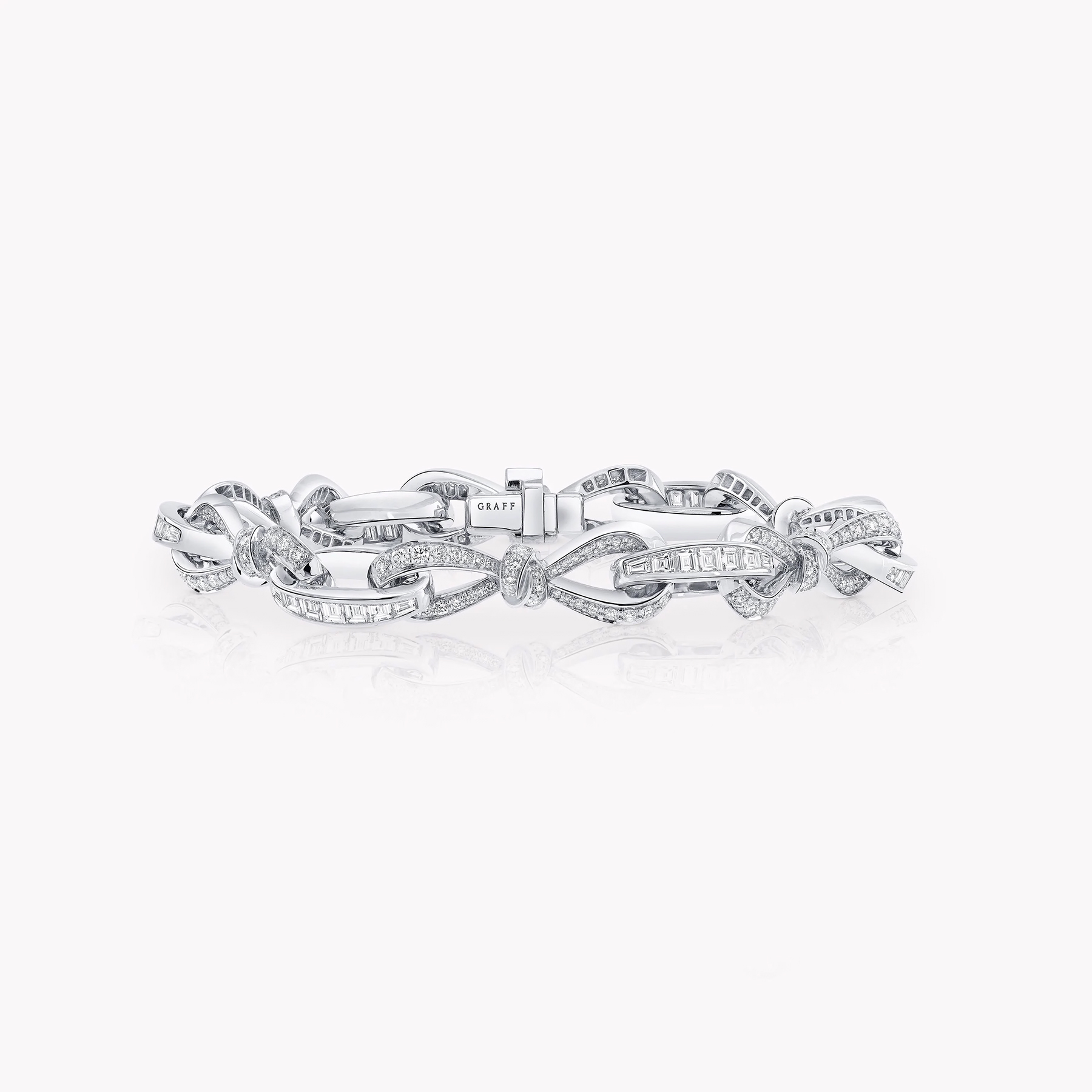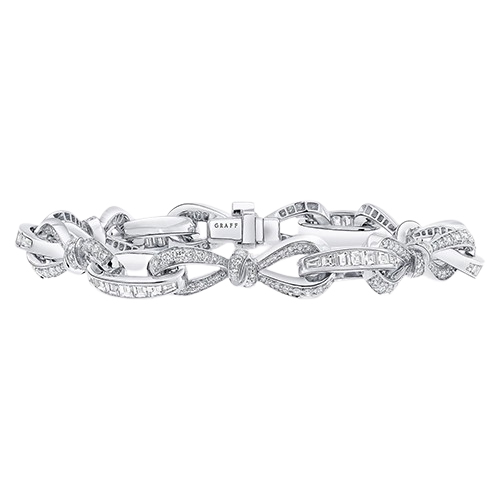 Современная интерпретация коллекции Tilda’s Bow воплощена в этом браслете, где изящные линии банта, выложенные круглыми бриллиантами паве, переплетаются вдоль всей длины украшения. Их соединяют овальные звенья, инкрустированные багетными бриллиантами, которые вручную закреплены мастерами Graff в утончённые композиции.