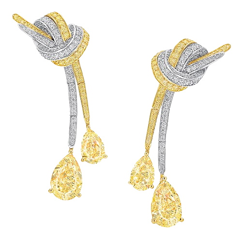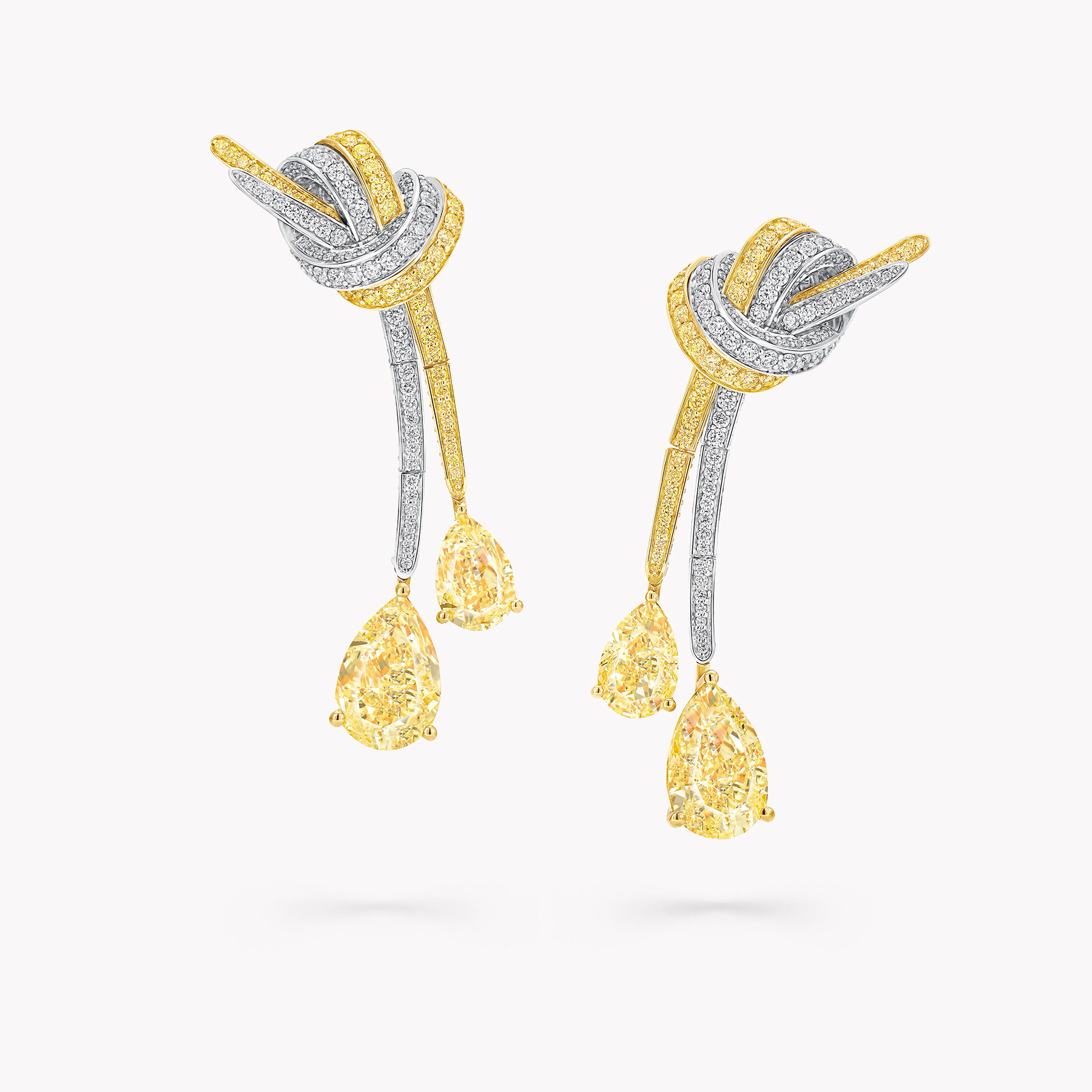 Пара изысканных серёг Tilda’s Bow High Jewellery воплощает искусство движения и света. Изогнутые линии из белых и жёлтых бриллиантов паве, общим весом около 11,95 карата, плавно переплетаются в утончённый узел, завершаясь элегантным акцентом — четырьмя фантазийными жёлтыми бриллиантами грушевидной формы, сияющими на концах композиции.