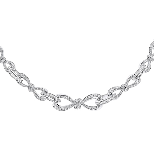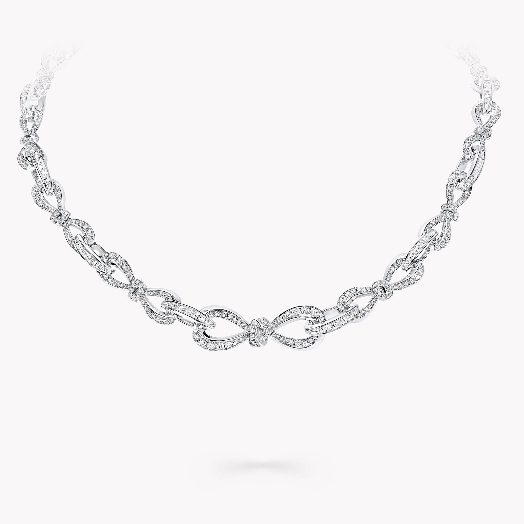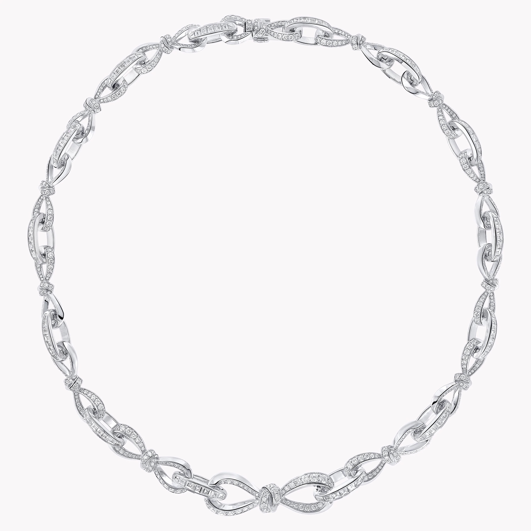 Современная интерпретация коллекции Tilda’s Bow воплощена в этом ожерелье, где изящные линии банта, выложенные круглыми бриллиантами паве, плавно переплетаются по всей длине изделия. Между ними расположены овальные звенья, усыпанные тщательно подобранными багетными бриллиантами, вручную закреплёнными мастерами Graff в утончённые композиции.