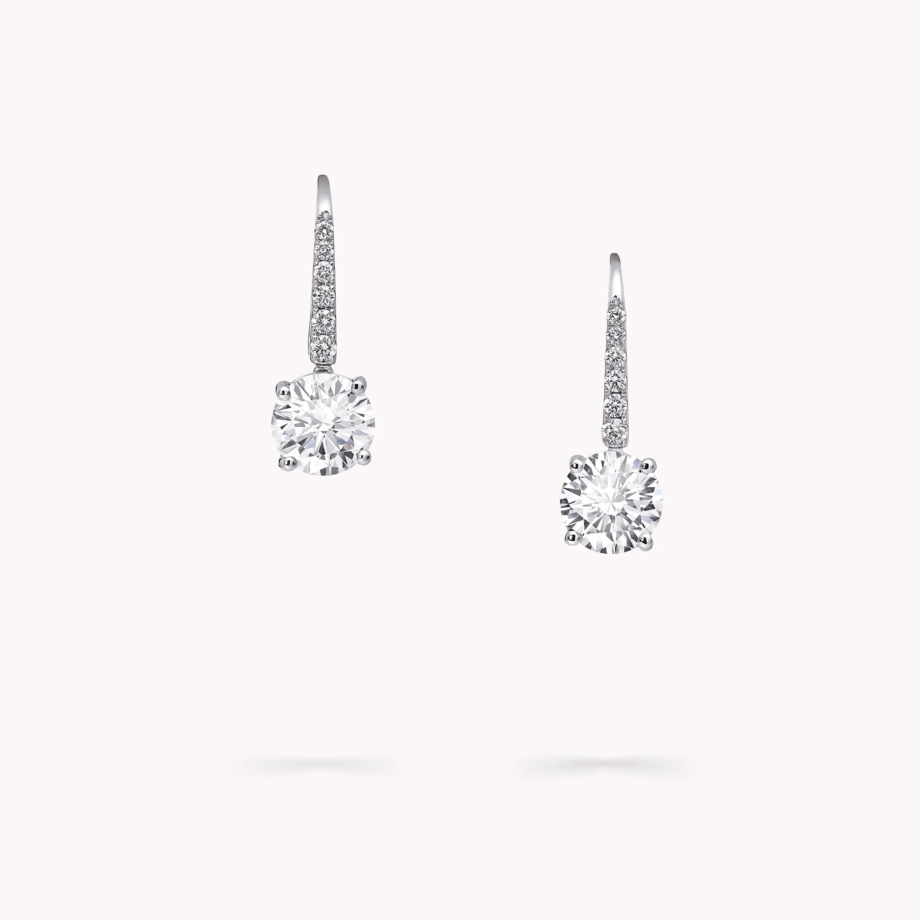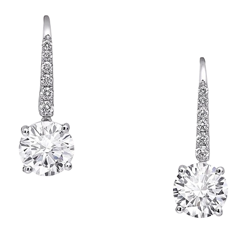 На изящных крючках, усыпанных паве из бриллиантов, сверкают безупречные бриллианты круглой огранки — в них заключено воплощение вечной элегантности. Минималистичное оправление с едва заметным количеством металла подчёркивает чистоту и ослепительное сияние камней, позволяя свету беспрепятственно играть на каждой грани.