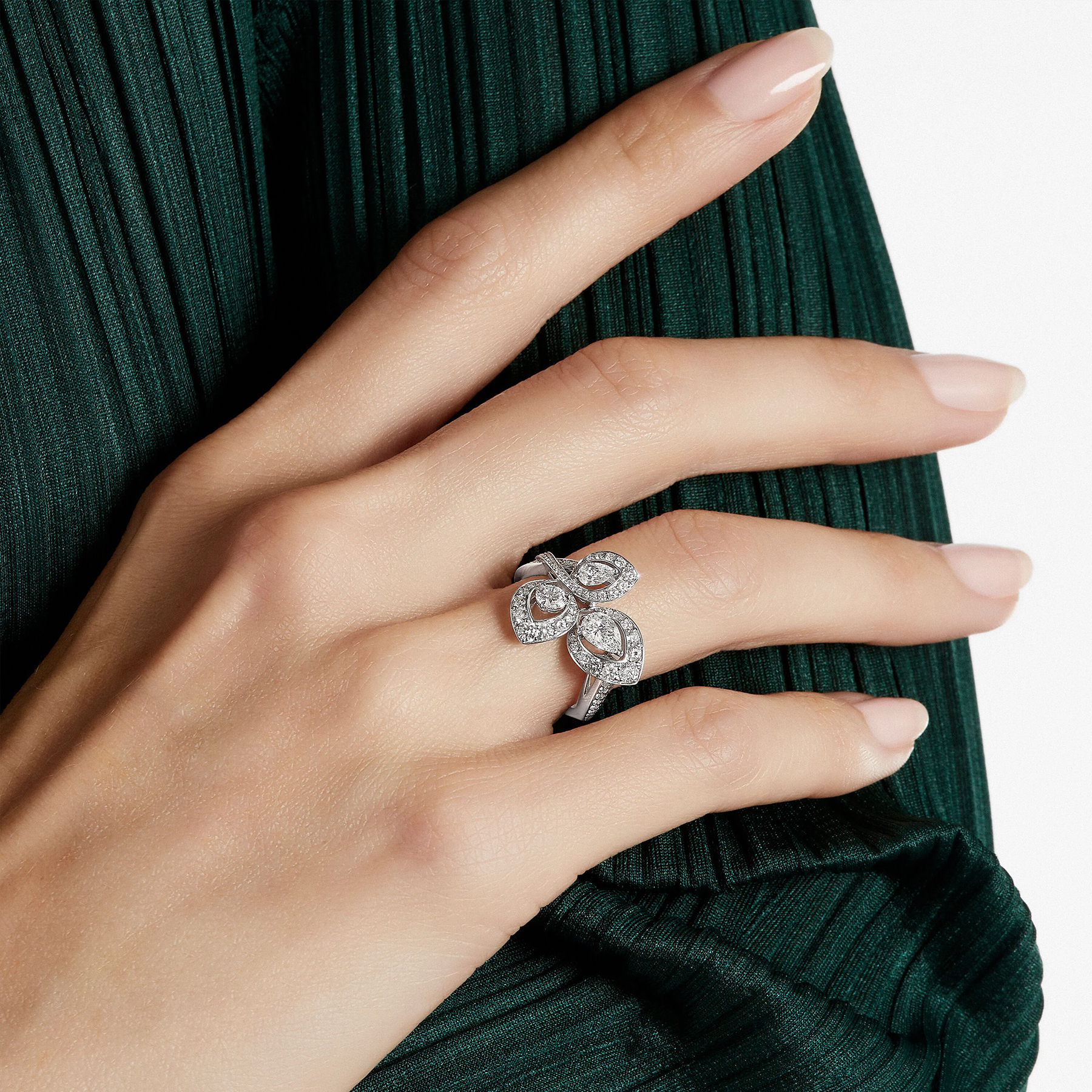Это утонченное кольцо из белого золота с бриллиантами принадлежит коллекции Classic Graff — вечным украшениям, прославляющим репутацию Дома за создание самых совершенных бриллиантов в мире.