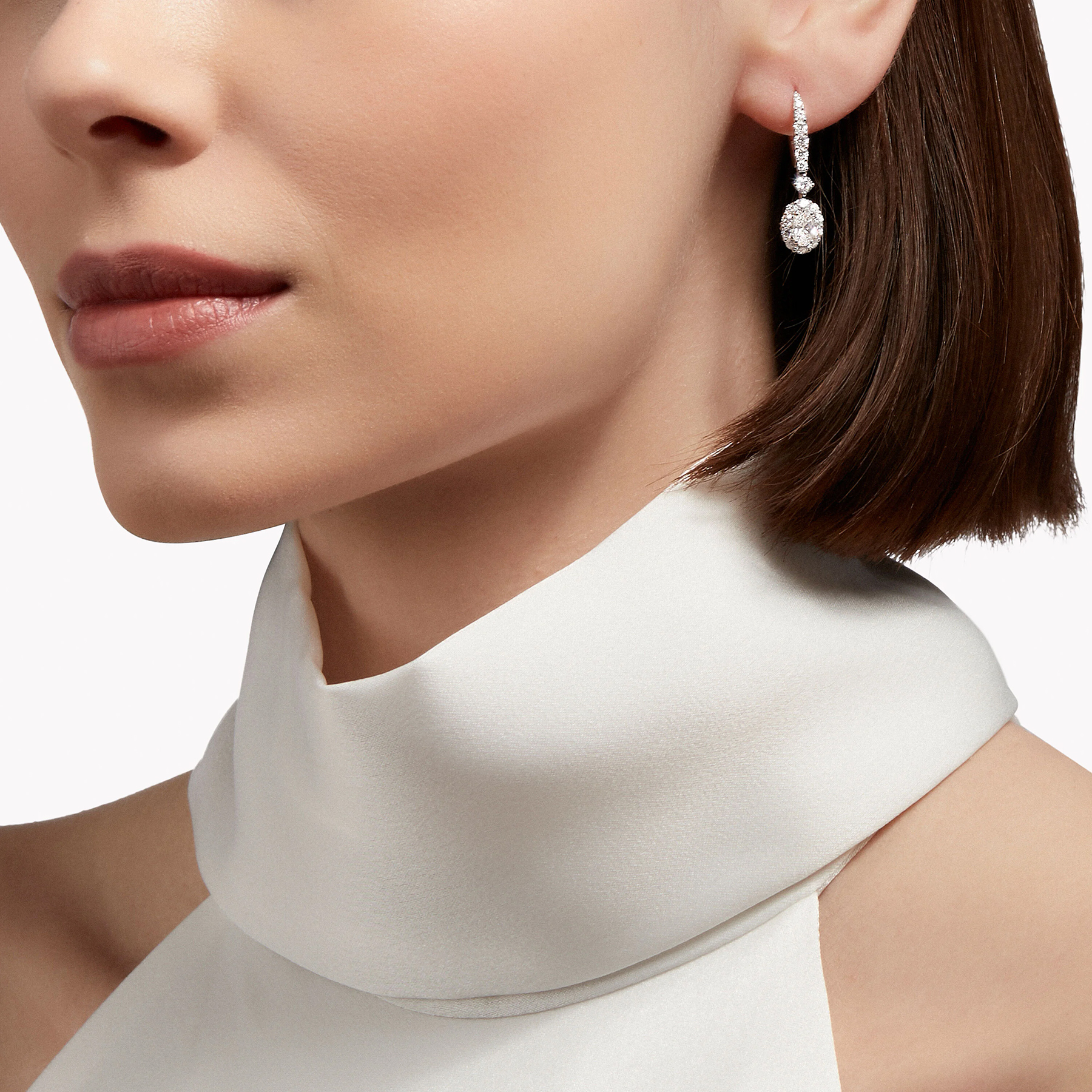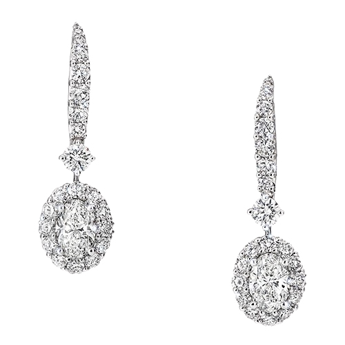 Изысканные серьги Graff Icon из белого золота восхищают своим сиянием и элегантностью. Два овальных бриллианта в центре окружены утончённым ореолом из pavé-камней, усиливающих игру света и подчёркивающих глубину их внутреннего сияния. Подвески, украшенные бриллиантовыми клипсами, изящно колышутся при каждом движении, создавая эффект живого блеска.