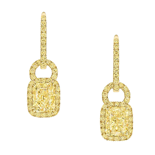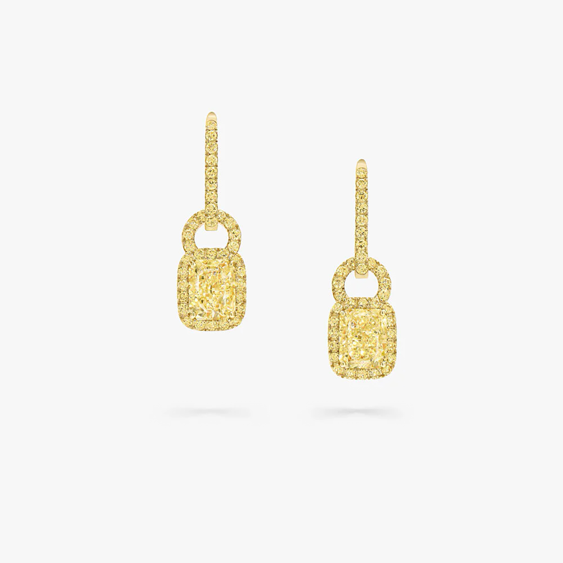 Пара серёг Icon 8 с бриллиантами фантазийного жёлтого цвета огранки «радиант» и бриллиантами паве общей массой около 5,08 карата — воплощение элегантности, света и совершенной гармонии.