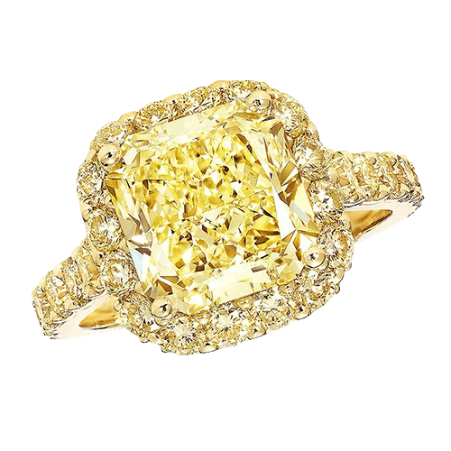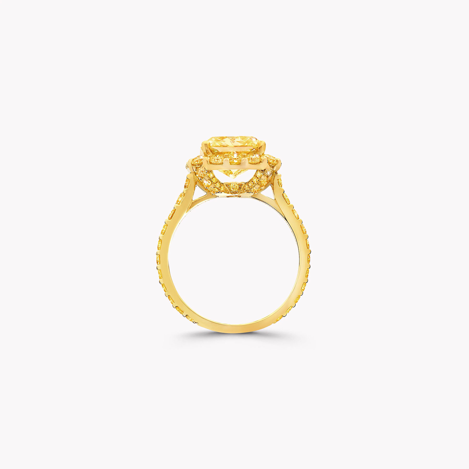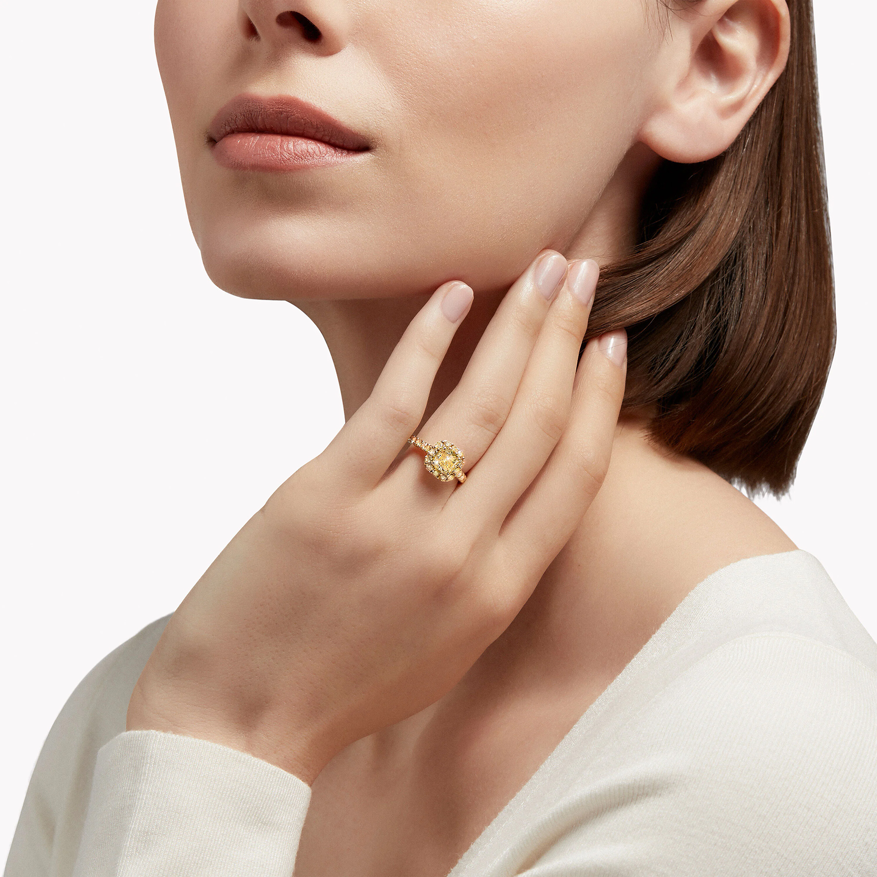 В центре кольца Icon сияет редчайший бриллиант огранки «радиант» насыщенного оттенка Fancy Vivid Yellow — один из самых ярких и живых тонов в мире природных камней. Эта огранка, сочетающая элегантную геометрию изумруда и ослепительное сияние круглого бриллианта, известна своей исключительной игрой света и глубиной блеска. Вокруг центрального камня мерцает ореол из бриллиантов паве в солнечных жёлтых оттенках, искусно подчеркнутых оправой из жёлтого золота, усиливающей сияние и насыщенность цвета.