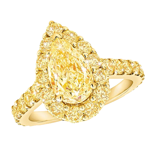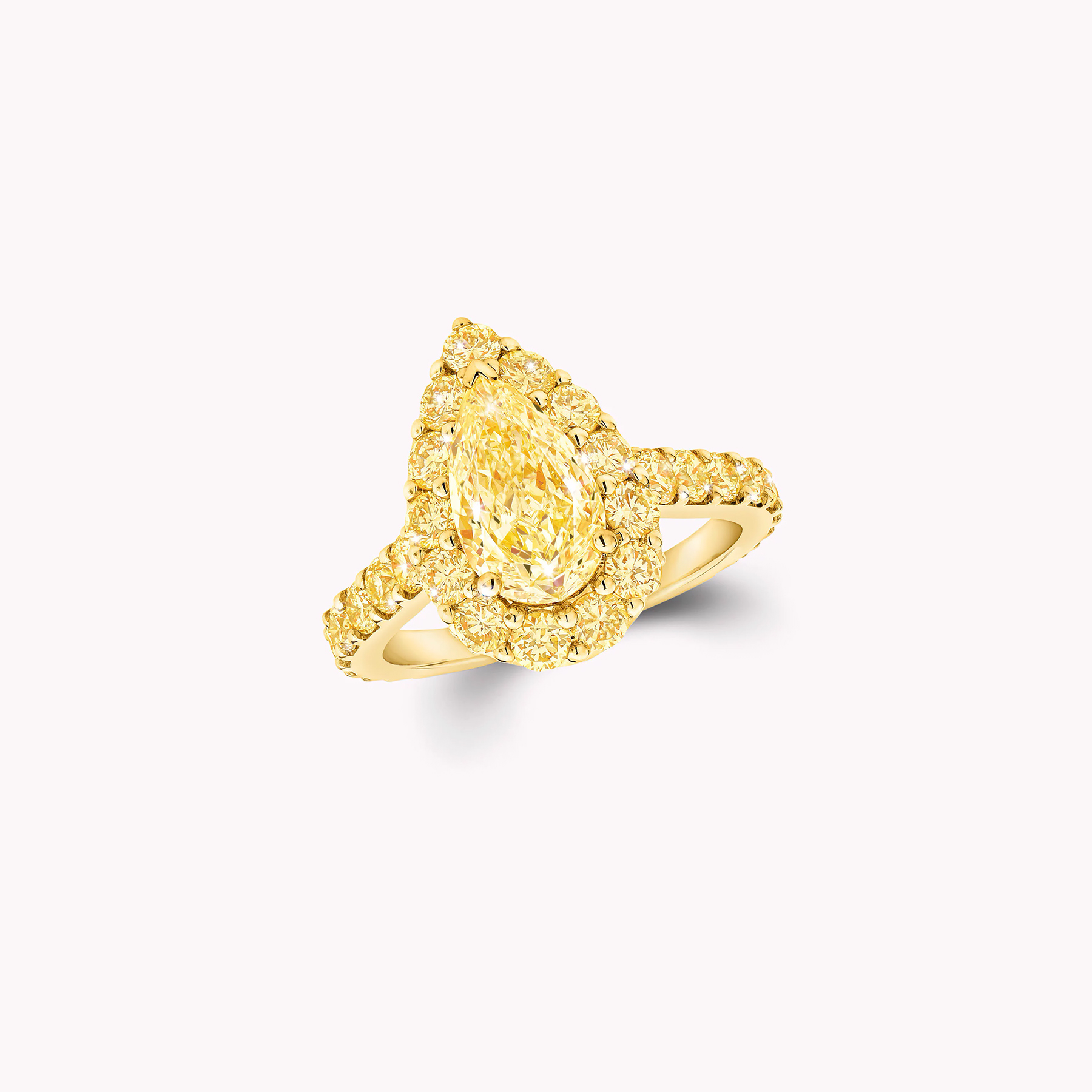 Очаровательное кольцо Icon с грушевидным бриллиантом Fancy Vivid Yellow и ореолом из жёлтых бриллиантов паве — это воплощение солнечного света и вечной элегантности, символ радости, страсти и мастерства Graff.