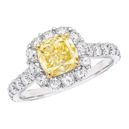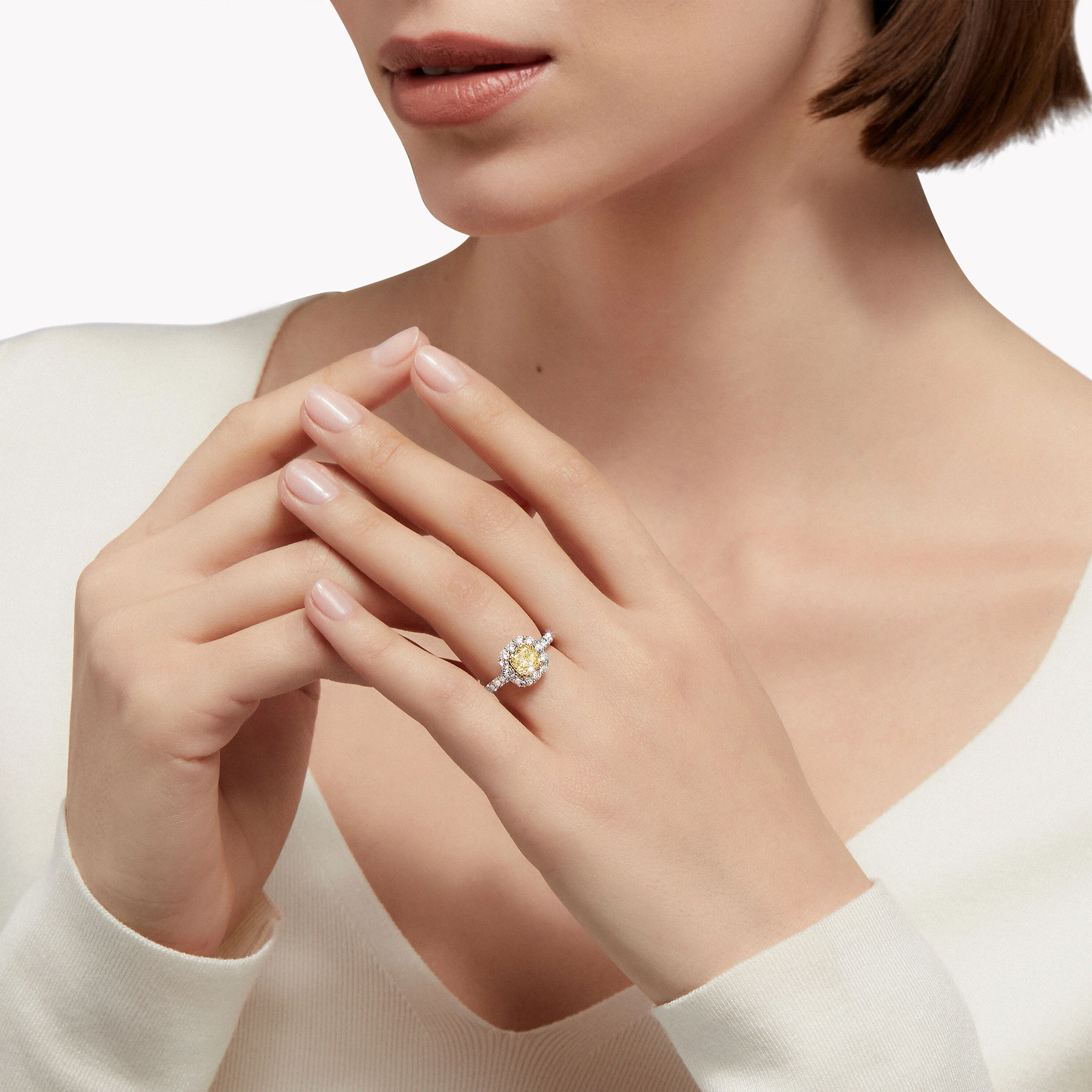 Очаровательное кольцо Icon с жёлтым бриллиантом огранки «кушон» и белыми бриллиантами паве общей массой около 2,93 карата, с центральным сертифицированным бриллиантом фантазийного жёлтого цвета весом 1,51 карата, — это воплощение сияния, элегантности и вечной красоты.