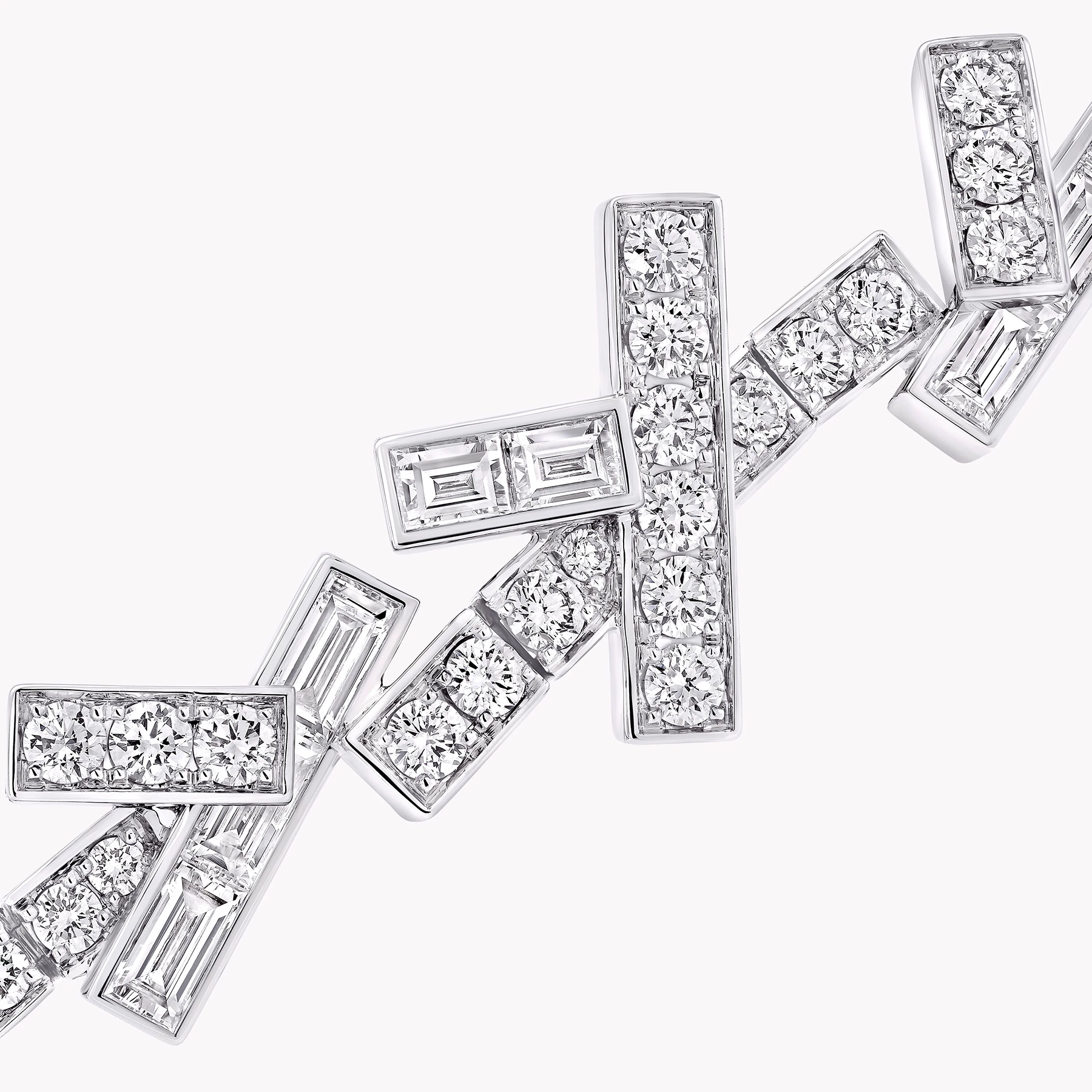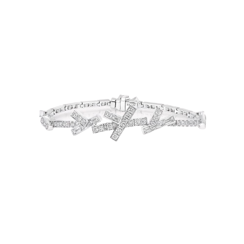 Современный и в то же время вневременной дизайн браслета Threads из белого золота воплощает идеальное сочетание архитектурной строгости и утончённого блеска. Графичные линии украшения выстроены из бриллиантов багетной и паве огранки, каждый из которых был индивидуально огранён и вручную закреплён мастерами Graff, чтобы подчеркнуть их кристальную чистоту и безупречное сияние.