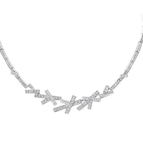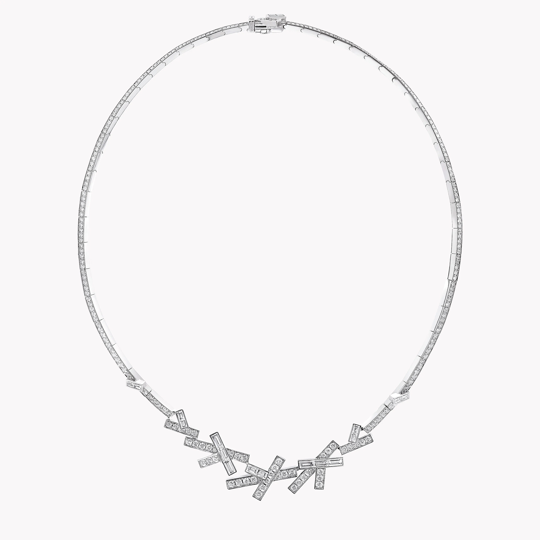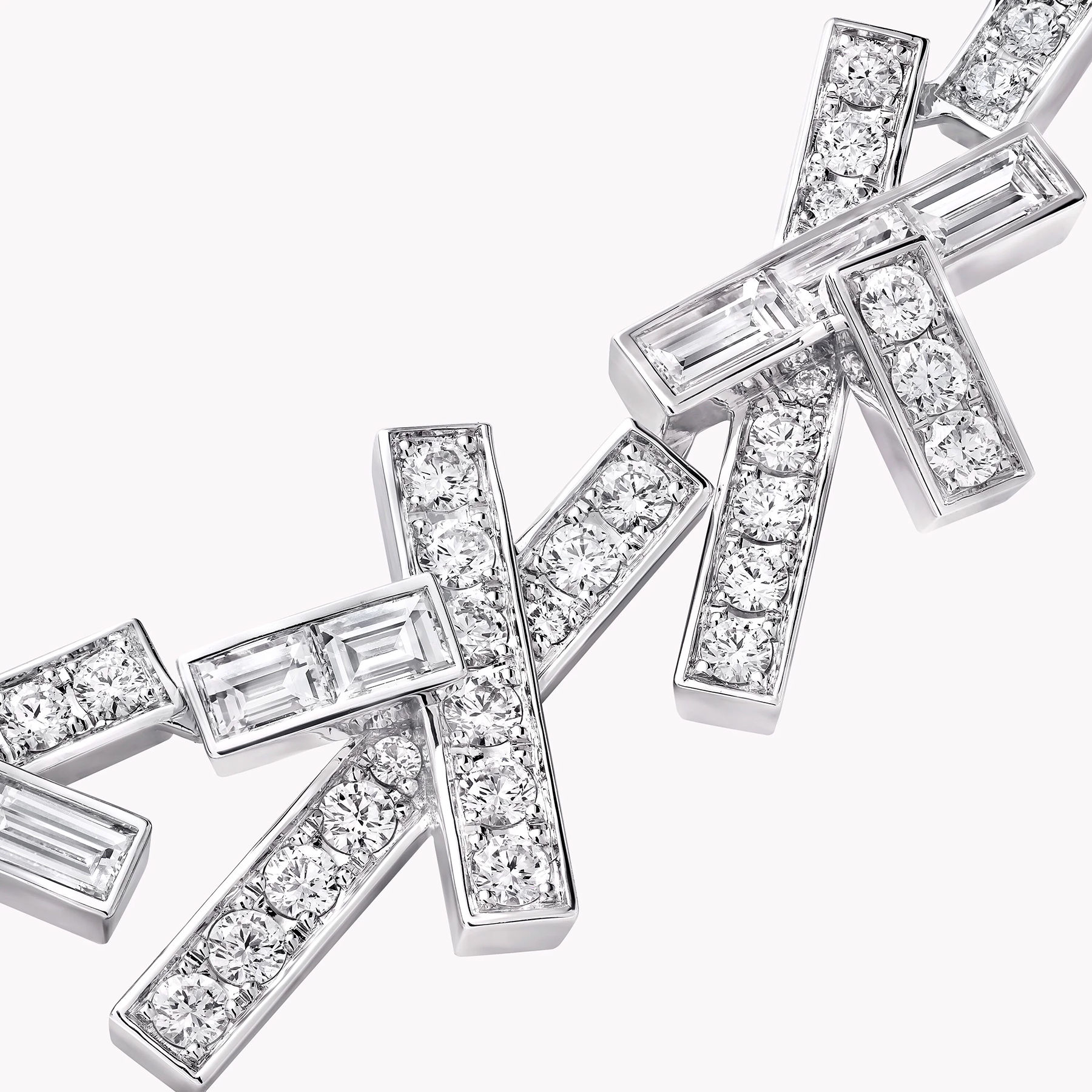 Графичное колье Threads с бриллиантами багетной и паве огранки общим весом около 6,25 карата — это смелое и элегантное произведение, в котором современная архитектурность встречается с вечной утончённостью, присущей ювелирному искусству Graff.